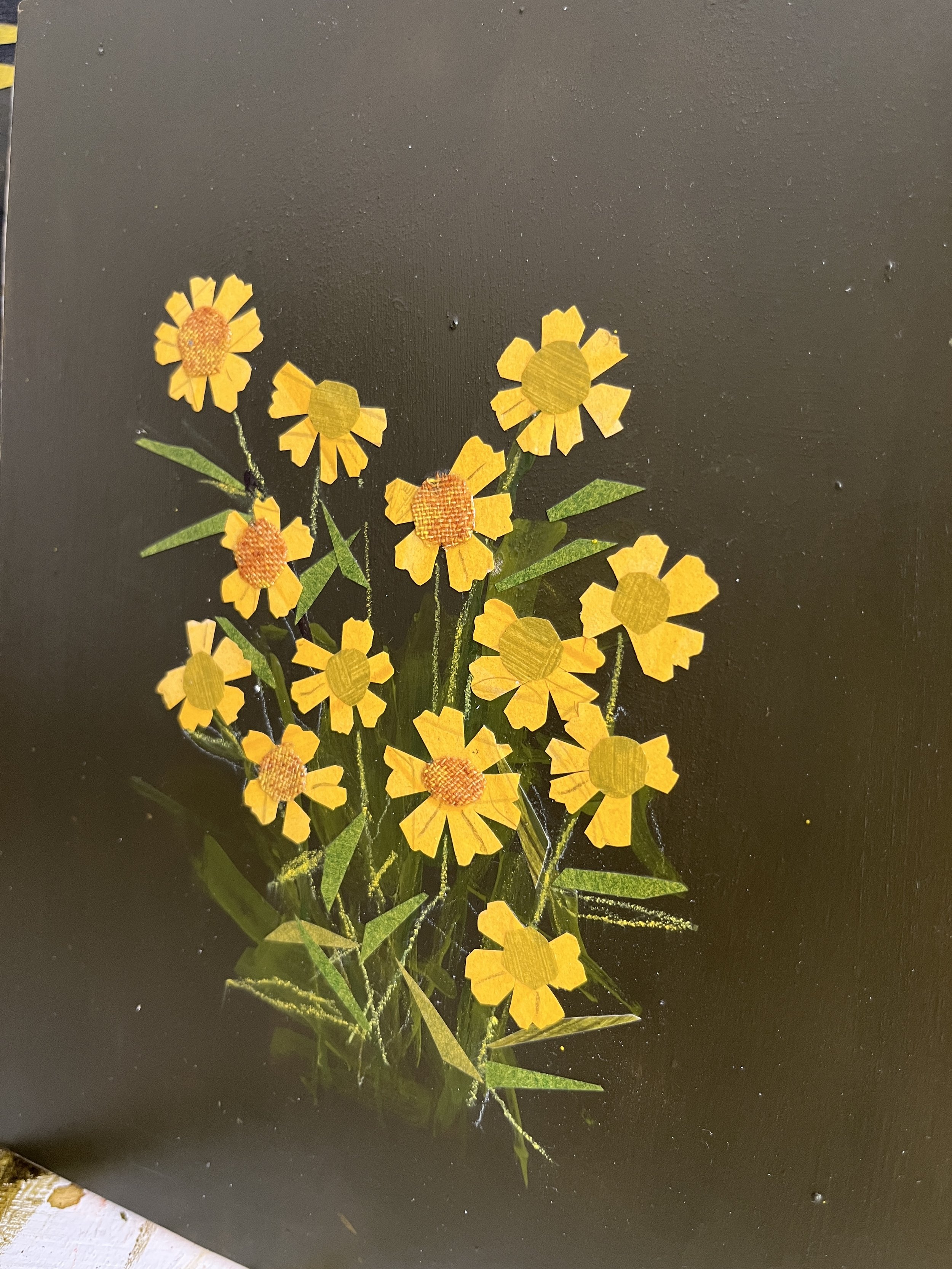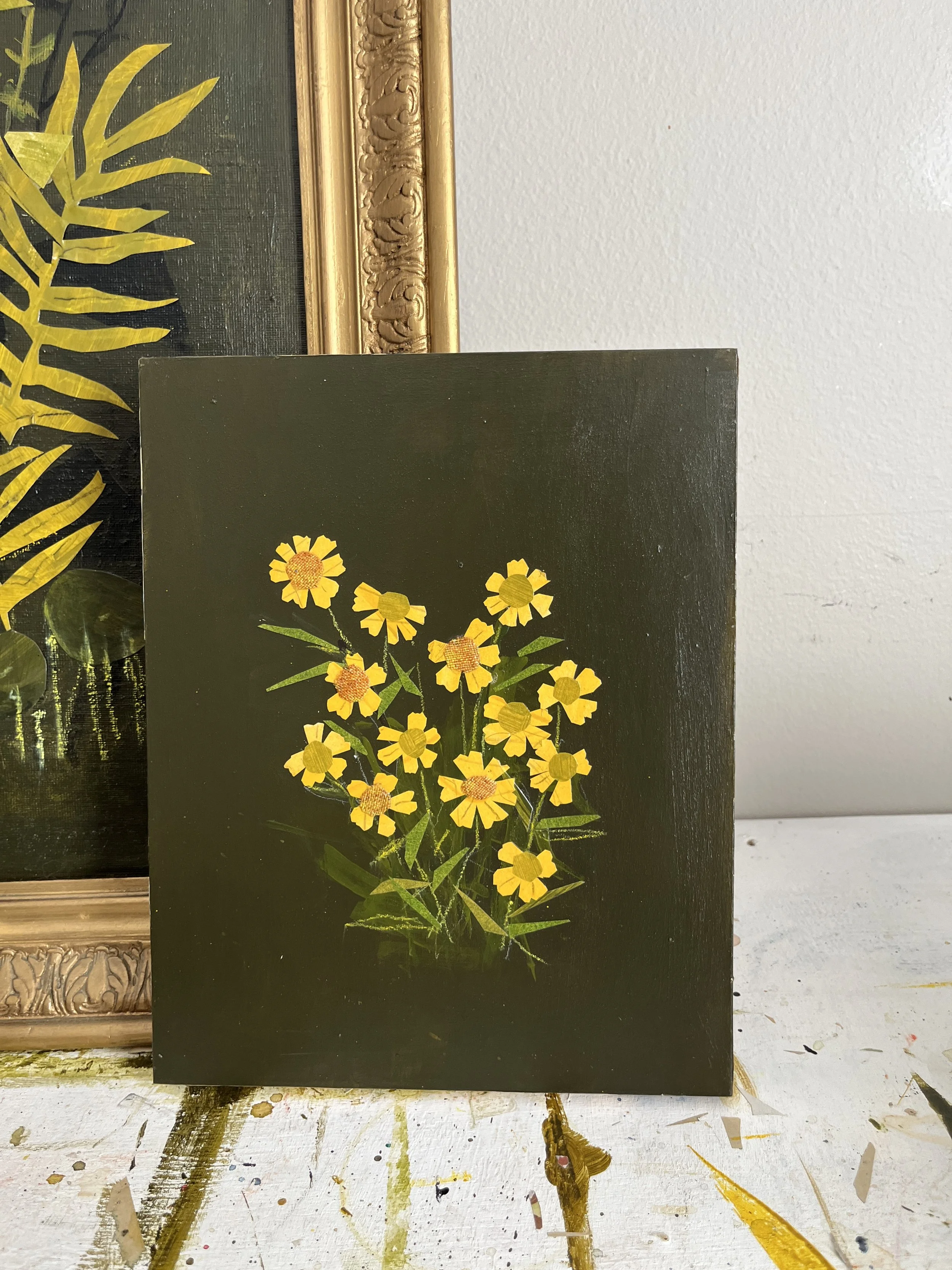 In my studio, I believe in the beauty of resourcefulness. Each collage is created with secondhand materials sourced from local thrift stores, estate sales and friends and family. Some paper is painted, other pieces are cut straight from books. Together they create an interesting tapestry of sources, connected by color and texture.